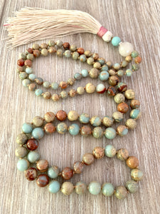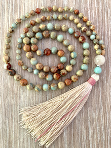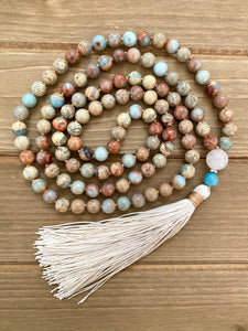 Soft tones of blue, brown, and beige make up the beautiful tones in this African Opal jasper mala necklace. Faceted Rose Quartz Guru bead is followed by a silver accent and amazonite bead. Beautiful ecru silk tassel with rose banding finished this calming piece. The jasper stones in this mala remind me of little Earths and will make you feel more grounded.