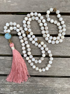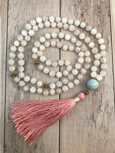 This series of malas is to honor women everywhere. Their strength, their struggles, their perseverance, their stillness, their warrior spirit and fierceness, the mother in all of them. I wanted to create a series of malas to honor what is going on at this point in time for women everywhere, to mark this moment of uprising and courage of the divine feminine. For the past few months, we have seen countless women speak their truth in the Me too and Times Up movements. The courage these women had is something that I wanted to celebrate. Women are demanding to be seen and treated as equals. It is that Divine Feminine Spirit that is present in all women that drives these movements. These malas are a tribute to all women who are sacrificing everyday for this cause, as well as the future generations that will reap its benefits. This series honors those that choose to speak out, those that choose to remain silent and strong, those that have endured difficulties, and those that have overcome or are in the process of overcoming. Each piece in the series contains Moonstone, a stone that I have been constantly drawn to in my art. It is the stone of feminine energy. The other stones were chosen based on the intentions of the mala. There are 4 malas in the series: The Lotus Moon Mala, The Divine Warrior Mala, The Divine Presence Mala, and The Divine Goddess Mala. I hope you can find one that speaks to you or a woman that you love.
