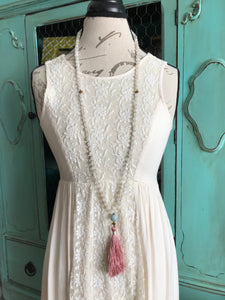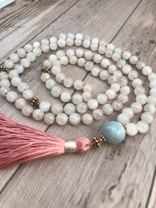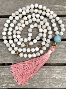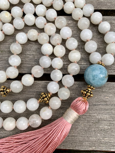 I have had the desire to create piece made with all moonstone for quite some time. There is something about this stone that has continually draws me to it. This mala was the inspiration for the entire collection. There is such beauty in the simpleness of this design, yet so much power and divinity in each of the stones. It truly represents the feminine spirit in this way. This piece represents the beautiful feminine energy that is present in both women and men. As living beings, we have both masculine and feminine energies flowing through us. It is about creating a healthy balance between these energies that makes us better people. Moonstone is known to enhance and balance this feminine energy. It is the perfect stone to serve as the foundation of the series, and it is the dominant stone in this beautiful mala necklace. Aquamarine helps to bring peace and calm in our lives, to connect us to the Divine courage that is in all of us. It aids in speaking your truth, and communicating that truth effectively. It helps to release anger, to let go, and to bring about positive change. All of the malas in this series incorporate Aquamarine. It fits perfectly with the motivations and intentions of the brave women today.