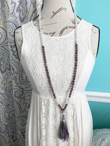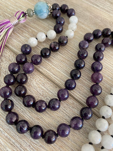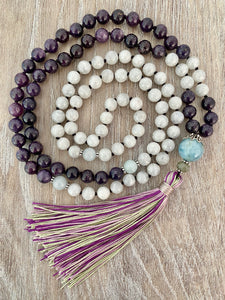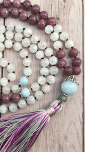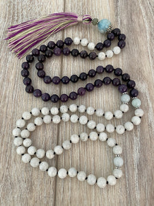 The mala honors the still strength present in every woman. This woman goes through life with a quiet and beautiful strength, and yet she endures . This woman has survived and is at peace with all that has happened in her life. Lepidolite is the stone of balance and harmony. It helps to bring about emotional healing and assists you with getting in touch with the innermost center of yourself known as the Divine Presence. It is about finding the peace and balance in all experiences, and this mala speaks that intention. Sometimes we experience things that are difficult, that we cannot talk about, and yet we quietly endure. It is only when we can come to terms about what has happened and let it go, that our spirit can find harmony and balance. This mala is about that experience. Aquamarine and Moonstone are also in this mala, as they are in all of the malas in this series. Moonstone is known to enhance and balance this feminine energy. It is the perfect stone to serve as the foundation of the series. Aquamarine helps to bring peace and calm in our lives, to connect us to the Divine courage that is in all of us. It aids in speaking your truth, and communicating that truth effectively. It helps to release anger, to let go, and to bring about positive change. All of the malas in this series incorporate Aquamarine. It fits perfectly with the motivations and intentions of the brave women today.