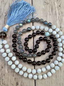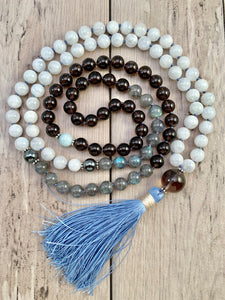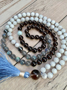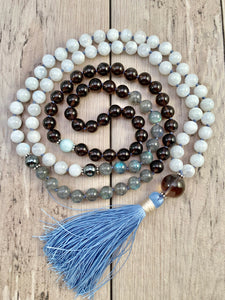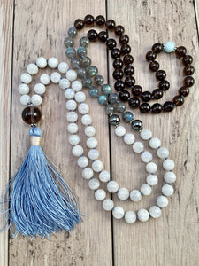 The Divine Soul Mala necklace is made with Moonstone, Labradorite, and Smokey quartz mantra beads. Hematite markers are at the 27th positions and an Aquamarine marker sits at the 54th position. Large Smokey Quartz guru bead sits above the handmade light blue tassel. It’s a beautiful combination of stones to support and ground you. Moonstone is a stone rich with feminine energy and is a great protection stone. Smokey Quartz and hematite are very grounding stones, and assist with removing negative energy. Labradorite, a stone for the third eye, helps with intuition while aquamarine assists in speaking your truth.