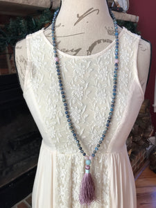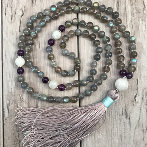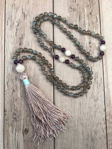 Gorgeous flashy labradorite and moonstone are handknotted on silver cord. Amethyst beads highlight the moonstone markers placed at the 27th and 54th position and sit above the guru bead too. Large moonstone guru bead sits above the handmade silk tassel. This beauty has 108 beads, plus the marker beads. These stones work so well together and look so beautiful. This piece can be made in either the 6mm size as shown, or the 8mm larger beads. Select your size in the drop-down menu.