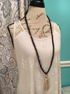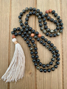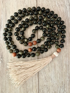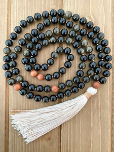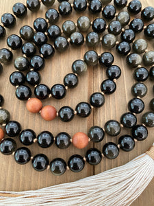 Simple and rustic, these gorgeous Obsidian beads have a light luminescence to them that catches the light in a beautiful shower of gold and grey flecks. Sandalwood beads are at the 27th and 54th markers, as well as the guru bead to add a rustic feel and flair to this mala. Hand-knotted on brown cord and finished with a handmade ecru silk tassel, these beads are a great gift for both men and women!