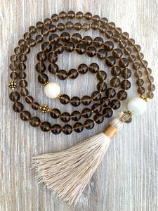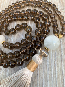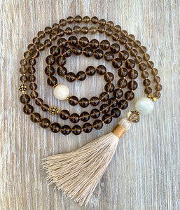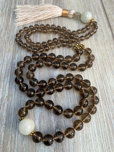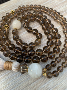This beautiful mala was originally created as a gift to myself. I have always loved smokey quartz, and it has remained a constant favorite since I fell in love with crystals years ago. There’s something about its grounding energy that draws me in This piece incorporates both 8mm and 6mm smokey quartz stones, as well as a diamond-shaped special cut smokey quartz bead just above the tassel. These stones are paired with 2 large moonstone beads, another amazing crystal that I love and incorporate in many of my creations Beautiful antique gold Bali beads serve as markers at the 27th positions. It’s a mala that is very close to my heart, and one that I wear and use often.