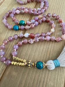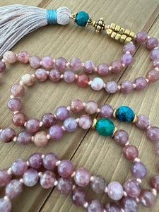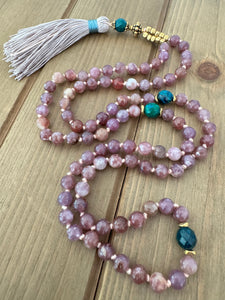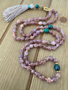 This beautiful mini mala is made with 6mm Lepidolite beads and 8mm faceted chrysocolla beads. Brass accents are placed throughout the piece and it’s finished with a silk tassel.