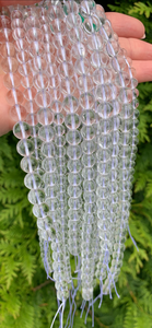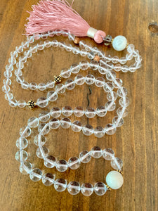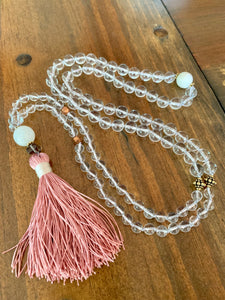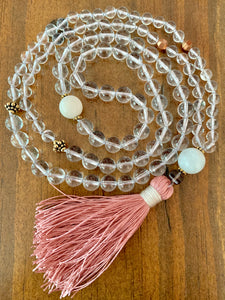 Moonstone is used as the beautiful guru and 54th marker. Quartz amplifies other crystals and what better pairing is there than moonstone? Known for its feminine energy and protection, it’s a beautiful compliment to the vibe in this mala. A small Smokey Quartz accent bead sits above the beautiful handmade silk tassel. Mixed metal markers are at the 9th and 27th position. They add textural depth and color to this clear and pure piece.