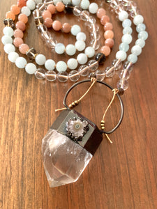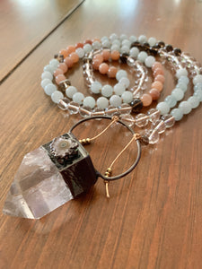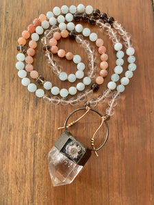 The Joy of Life Mala is a one of a kind piece. This mala was created around that gorgeous large clear quartz point pendant. This pendant also features an amethyst stalactite at the top. Scroll to see it in more detail. Clear quartz is a great stone for cultivating clarity and to take on your travels. Mantra beads are grade AA Aquamarine, Grade AA Clear and Smokey Quartz, and Grade AA Sunstone that I had left from the beautiful batch used for last month’s full moon series. Aquamarine is so calming to the mind and Sunstone is the stone of happiness and joy. Small faceted gold pyrite beads finish off the knotting cord and add a touch of glow to this piece. This mala is all about cultivating joy. I hope whoever takes her home feels the pure joy there is in life.