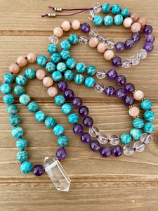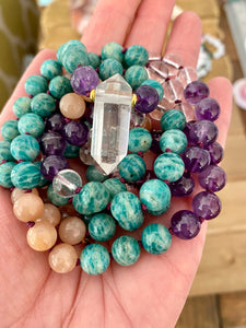 Inspired by this month’s full moon mala, this beautiful mala has the same gemstone combo and a gorgeous double-terminated clear quartz pendant. I had one strand left of this gorgeous bandedGrade AA Russian Amazonite and I just had to use it!