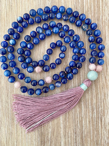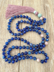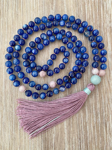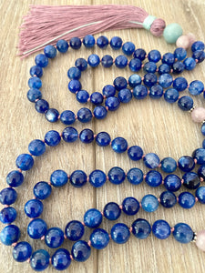 Gorgeous Kyanite is hand-knotted to make this unique mala necklace. Kyanite is an amazing stone. I could not believe the density of this stone, and how it feels in your hands. It also catches the light from different angles and beautiful blues, greens, and silvers are flashed throughout the stone. Kunzite bead markers are placed at the 27th and 54th positions, in addition to right above the guru bead. This piece has a total of 108 beads, plus the markers. Silver spacers are added to the design and it's finished with a handmade silk tassel.