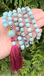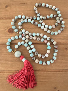 The Mala in the photo is made with a mix of mostly Larimar w/matrix and 10 Grade AA Larimar beads patterned into the Mala.