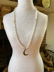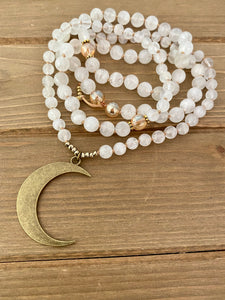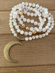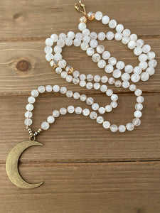 This stunning Mala is made with a combination of 6mm and 8mm Moonstone beads Golden Angel Aura Quartz markers add light and warmth to this piece Tiny faceted hematite beads make perfect accents and remind me of stars in the sky. It’s finished with a beautiful Crescent Moon Pendant, making a perfect finish to this Mala.