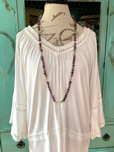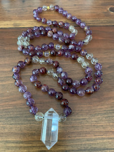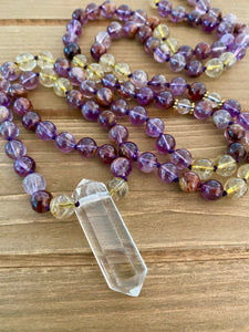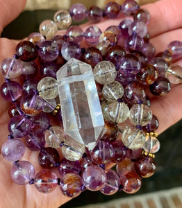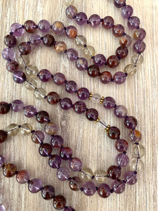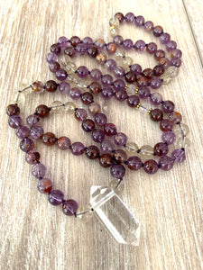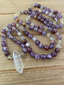 This mala is very special to my heart. I have been wanting to create a mala with this gemstone combination for a very long time, and yesterday, the creative muse visited me and the Light the Way Mala was born. This beautiful mala has some of my very favorite gemstones. It's made with Super Seven, Golden Rutilated Quartz, and Clear Quartz. The stone combination is very calming and I find it helps with some anxiety that I have during this "new normal" that we are experiencing.