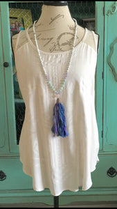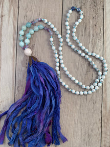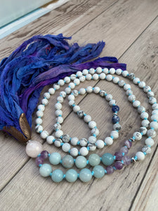 This gorgeous mala necklace has the most peaceful, calming colors. Howlite, Amazonite, and Amethyst are hand-knotted on sky blue cord and finished with a hand-made sari silk tassel. Two Sodalite Beads meet at the top. Beautiful faceted large Rose Quartz Guru bead sits atop the tassel. The lotus flower brass cap on the tassel is another stunning and unique attribute of this necklace. Very calming stones to wear, and very visually appealing. You are sure to get many compliments on this beauty.