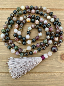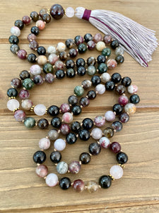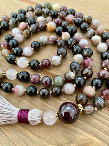 Tourmaline stones have a stunning variation of color, and you can see all of its beauty in this hand-knotted 108 bead mala necklace. Tourmaline is one of October's birthstones, along with the more commonly known Opal. It has a powerful energy and one you can feel when wearing this mala. Rose quartz stones placed at the 27th and 54th markers. These stones are simply markers to help with counting your mantras, and are not part of the 108 bead count. The garnet stones and gold accents add beauty and compliment the many colors found in the tourmaline. It's a truly stunning piece.