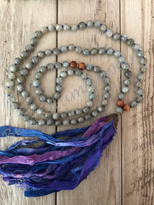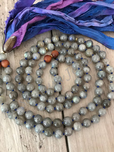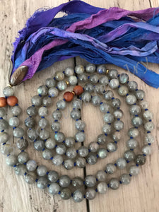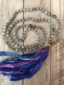Gorgeous labradorite is accented with sandalwood and gold in this traditional 108 hand-knotted necklace. Gold accents are placed at the 27th and 54th markers to make this a Tibetan style mantra mala. Handmade sari silk tassel is topped with a beautiful lotus flower cap. This necklace is an absolutely stunning addition to your accessory wardrobe!