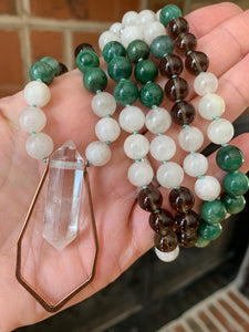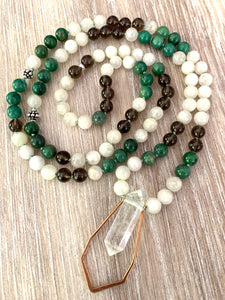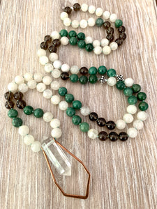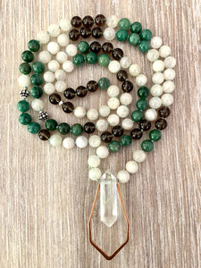 This beautiful mala is filled with joyful energy. It all begins with the double terminated clear quartz pendant surrounded by a copper frame. It’s a fun way to accent that gorgeous pendant. Mantra beads are a happy combo of African Jade, Moonstone, and Smokey Quartz with antique silver Bali bead markers. These stones all have joyful, grounding vibes, with a gentle, calming energy. It is a mala made to cultivate happiness and contentment with the self. Perfect energy for our world today.