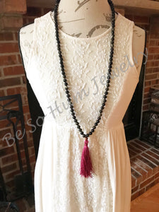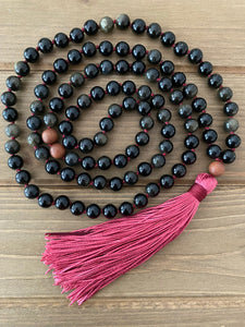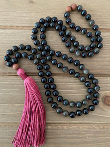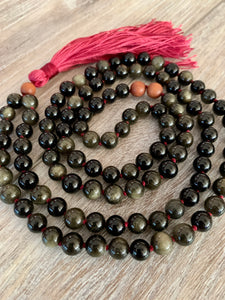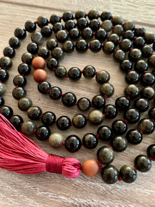 Simple and rustic, these gorgeous Obsidian beads have a light luminescence to them that catches the light in a beautiful shower of gold and grey flecks. Most of the beads are solid black, but every once and awhile, you see that flash! Sandalwood beads are at the 54th markers, as well as the guru bead to add a rustic feel and flair to this mala. Hand-knotted on red cord and finished with a handmade red silk tassel, these beads are a great gift for both men and women!
