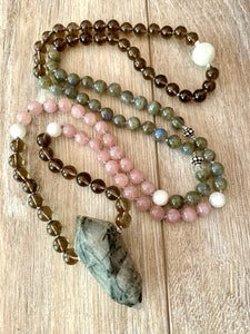 The manta beads are all Grade AA Madagascar Rose Quartz, Smokey Quartz, Labradorite, and Moonstone. These stones work together to elevate the positive energy of the heart, mind, and spirit, while keeping you grounded and in touch with the tranquillity that exists in all of us.
